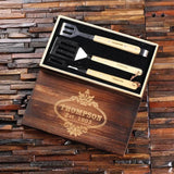 This 4pc set (including wood box) is quite amazing with every essential utensil you need for a successful grill! What a gift for any holiday! Labor Day, Christmas, Memorial Day, Easter, Fathers Day, Etc. Your family name and lineage can be engraved on every solid wood piece.