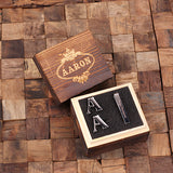 Stylish letter cufflinks and engraved tie bar set with wood gift box personalised to your request.